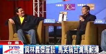 這邊造勢炮火很猛,另一頭則是溫馨的感性座談,馬英九和極限長跑好手林義杰面對面大講冷笑話。極限長跑好手林義杰:“在沙漠的時候,蒙古人騎的馬,他們的馬已經跑不動了,就是因為路途太長,動物可能沒辦法接受。”馬英九:“臺灣的馬不會這樣。”