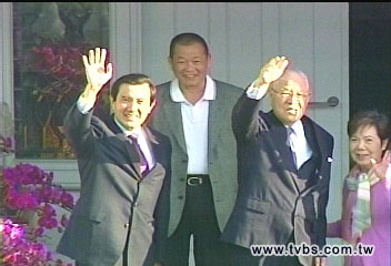 馬英九和蕭萬長到來后,李登輝走下階梯“恭迎”上樓,回過頭還不忘提醒馬英九對面有媒體在守候。馬英九舉起手來,兩人一起向媒體揮手致意,隨即進入室內密談。