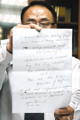 中新網(wǎng)5月8日電 臺當局“金援丑聞案”中間人吳思材的律師徐景星,7日公開吳思材在收押前留下的“保命信”,對先前的說法大翻供,律師稱吳思材手寫的“洗錢分配流程”,兩千九百八十萬美元是匯回臺灣給官員。