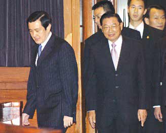 馬英九10晚在5.20后首次出席海基會臺商端節聯誼活動晚宴,與今天赴大陸展開兩會復談的海基會董事長江丙坤一同進入會場。 聯合報圖