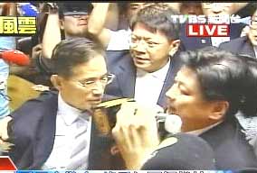 經劉盛良幾度宣布休息進行協商,仍無法平息藍綠“立委”的爭議,此時趕來的民進黨、國民黨“立委”愈來愈多,在國民黨“立委”周守訓要求先進行會議詢答、蔣孝嚴提出散會動議后,雙方沖突一觸即發。
