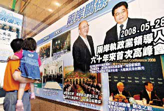 趕在7月4日大陸觀光客首發團來臺前夕,國民黨2日連夜重新布置一樓大廳的兩側墻面,將原先的國民黨創黨113周年紀念展照片全數撤下,換成以“兩岸關系雨過天晴”等為主題的照片展,其中“胡連會”與“胡吳會”的歷史鏡頭,被放大貼在一樓大廳的左側墻面,所有訪客進入大廳時,都會看見吳伯雄與胡錦濤的大合照。