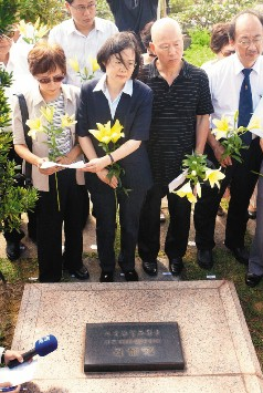 民進黨主席蔡英文(左二)25日上午帶領前主席許信良(右二)等人分別前往前主席江鵬堅和黃信介墓園舉行追思會。(圖片來源:臺灣《聯合報》)