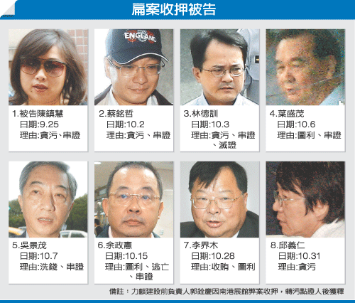 最早被收押的是卷入陳水扁家族洗錢疑案的力麒建設公司負責人郭銓慶,他在9月12日就因被臺北地檢署查出另涉世貿南港展覽館興建工程行賄標案評選委員弊案,檢察官傳喚他到案,向臺北地方法院聲請羈押禁見獲準。此后,除了機要費案和洗錢密賬案外,又開始不斷開花。案外案不斷,以致在一個多月內連續收押陳水扁任內出納陳鎮慧、“總統夫人助理”蔡銘哲、前陳水扁辦公室主任林德訓、泄密的前“調查局長”葉盛茂、陳水扁妻子哥哥吳景茂、前“內政部長”余政憲等人。