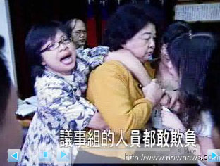 “項目報告啦,項目報告嘛”,“先讓她念完再報告嘛!”藍綠雙方拉扯成一團。會議主席在上面大喊,連議事組的人員都敢欺負。