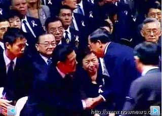 此時,馬英九起身回禮,扁、馬短暫交流,隨后陳水扁和“副總統”蕭萬長夫人朱俶賢及“前副總統”連戰也握手致意,但馬英九之前見陳水扁上前還禮貌起身,相形之下,朱俶賢與連戰則是坐著握手,一旁的連方瑀連看都不想看陳水扁。