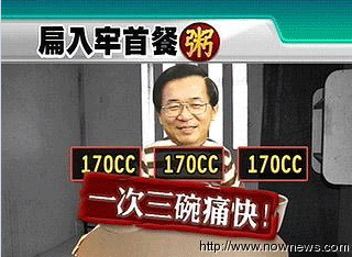 中新網11月28日電 據臺灣“今日新聞”報道,身陷洗錢疑云的陳水扁遭收押后即以禁食抗議,不過,昨天(27日)晚間已恢復進食,不但喝了500毫升的粥,還吃了一顆水煮蛋。國民黨“立委”邱毅諷陳水扁說,別一口氣吃太多,以免“瀉肚”。