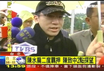 中新網12月30日電 據臺灣TVBS報道,陳水扁第二度遭到羈押,由于沒有禁見,他的兒子陳致中在今天下午兩點到臺北看守所探視。