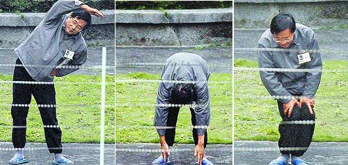 接著扁開始抬腿、散步暖身,還向記者打招呼,然后扁開始抬膝蓋、雙手上下左右伸展;扁雙手向上舉時一度停了一分半鐘,還臉帶笑意朝記者望去,似乎故意要擺給記者看。