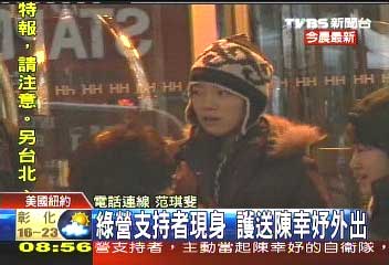 中新網(wǎng)2月6日電 據(jù)臺灣TVBS報道,人還在紐約的陳水扁女兒陳幸妤,在當(dāng)?shù)貢r間早上10點(diǎn)半左右,前往紐約大學(xué)牙醫(yī)學(xué)系,走出飯店時,出現(xiàn)綠營支持者,主動當(dāng)起陳幸妤的自衛(wèi)隊(duì),一度跟昨天向陳幸妤嗆聲的藍(lán)營支持者,發(fā)生口角。