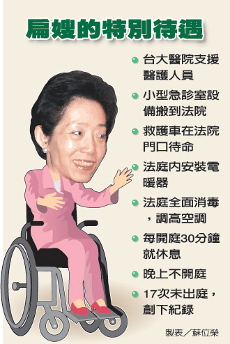 10日的合議庭將針機要費案、洗錢案及南港展館、龍潭購地案中分涉貪污部分進行準備程序庭,屆時,特偵組將派出林嚞慧、李海龍、周士榆三名檢察官,以及臺北地檢署公訴團隊林勤綱、林達和林怡君共同蒞庭,而因應吳淑珍出庭,北院已聯絡臺大醫院提供醫療協助,臺大將派出全臺只有2輛、造價600萬的加護型救護車與4名醫護人員待命,庭訊并破天荒地改成30分鐘休息一次,同時將第七法庭對面的第八法庭改為醫療間,而法警更將全員禁止休假,全部繃緊神經備戰。