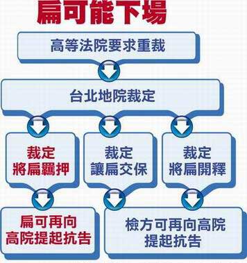 陳水扁去年底被起訴、無保釋放后,立即提起抗告,臺灣高等法院于十二月十七日認為,扁可能在審判中影響證人造成案件審理困難,駁回抗告;十二月二十八日,法院認定扁的犯罪嫌疑重大,且扁家在海外有十幾億元資產,隨扈又無法確實監(jiān)管其行蹤,有逃亡、勾串、滅證等羈押理由;今年一月七日時,仍認同檢方意見,同意押扁。