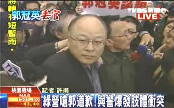 當郭冠英搭上座車離開時,抗議人士還追打座車,黑衣男子則揮拳毆打抗議人士,雙方人馬在機場外持續叫囂。
