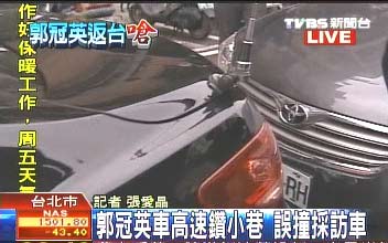 之后,郭冠英座車抵達臺北市區,在媒體車輛的跟拍下,發現郭冠英的座車在臺北市大小街頭繞來繞去,并未前往“新聞局”也未返家,似乎想要把記者跟車甩掉。郭冠英座車甚至一度和緊跟的媒體采訪車在臺北醫學院附近發生輕微擦撞,由于人車并無大礙,郭冠英車輛隨即再度駛離,并繼續在臺北街頭亂逛。