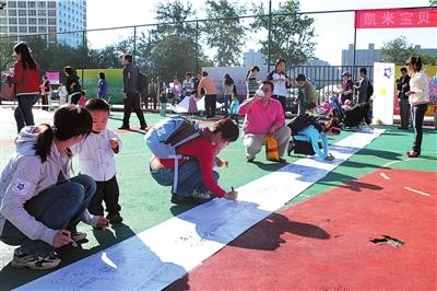 昨天上午9點,建外SOHO文化體育廣場迎來首屆寶寶亞運會。百余名寶寶在家長的引導下,在象征著亞運會開幕時間的11.12米長的橫幅上,親手寫下自己的名字和祝福。活動現場,寶寶們在父母的陪伴下盡享運動的樂趣。據了解,此次活動是由朝陽區建外社區及中國婦女兒童喜愛品牌辦公室聯合主辦,橫幅將于近日寄往亞運組委會。