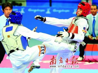 在跆拳道男子80公斤以下級(jí)決賽中,阿富汗選手內(nèi)薩爾·艾哈邁德·巴哈維(右)以3比4負(fù)于約旦選手納比勒·哈桑,獲得亞軍! ⌒氯A社發(fā)