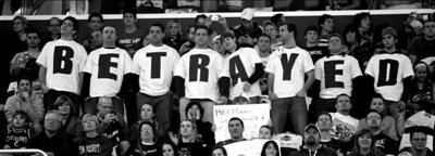 幾名球迷用上衣組成了“背叛”字樣,在現場發泄著被詹姆斯遺棄后的怨氣。