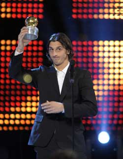 12日晚,效力于意甲國(guó)際米蘭隊(duì)的瑞典國(guó)腳伊布拉希莫維奇在斯德哥爾摩榮獲2007年瑞典最佳男足運(yùn)動(dòng)員稱(chēng)號(hào)。