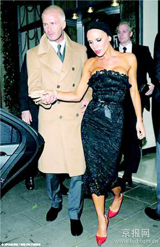 夫唱婦隨,維多利亞的穿著打扮也同樣的老氣橫生。當晚維多利亞穿了一件鑲嵌蕾絲邊的連衣裙,腰間別了個蝴蝶結,頭發盤起,頭上戴著黑色頭箍,臉上的妝依舊畫得很濃,還穿了雙紅色高跟鞋。不知道是擦得粉太重,還是新年活動過于忙碌而體力透支,鎂光燈下的“辣妹”一臉慘白形像老態。英媒體諷刺這身打扮超出了她33歲的年齡,看起來簡直可與丑劇大師馬塞歐比肩。(記者劉大偉)