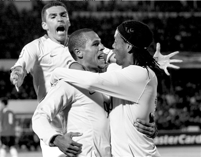 法比亞諾(中)和隊友小羅(右)、盧西奧慶祝進球。