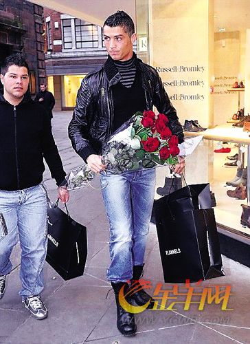 24歲的曼聯球星當天攜一名友人一起出行,他們在曼徹斯特一家高級商店花了1萬英鎊,買走了幾套休閑服裝。真可謂一擲千金。而當天還有C·羅的球迷發現了他們,興奮的球迷送給了C·羅一束火紅的玫瑰。手持玫瑰的C·羅看上去更加娘娘腔了。