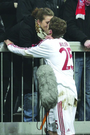 這位在租借而來的前鋒多諾萬回到美國大聯(lián)盟之后才得到出場機會的小將,在昨晨比賽的第72分鐘登場,這也是他在歐冠聯(lián)賽中的處子秀,然而17分鐘過后,他就在一次角球混戰(zhàn)中攻入了個人的歐冠聯(lián)賽處子球。進球后的穆勒顯得非常興奮,飛奔到看臺上女友所在的位置,而他的女友很默契地送上了浪漫一吻。看到這對恩愛的小情侶,現(xiàn)場所有觀眾都送出了自己的掌聲。