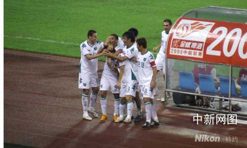 上半場第17分鐘,曹軒左路得球一腳直傳,閻嵩跟上將皮球傳中,中路的蔡楚川高高躍起,將球頂入長春亞泰隊的大門,浙江綠城終于收獲首粒進球。2分鐘后,長春隊獲得一次反擊良機,但達扎吉禁區內得球后起腳射門,球被姜波撲出底線。