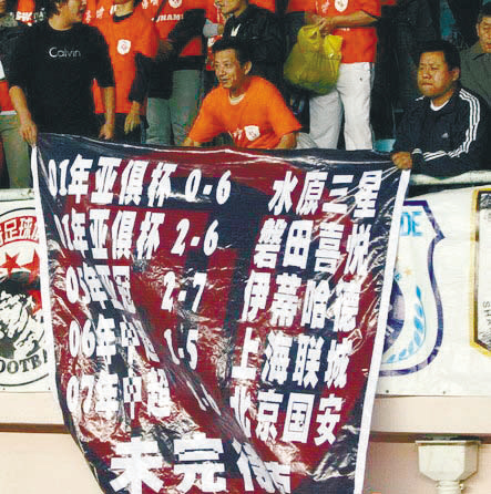 廣州醫藥隊0比6慘敗給亞泰,這場比賽引來無數質疑。上海球迷打出這個標語表示廣州隊的表現太對不起中超的球迷。