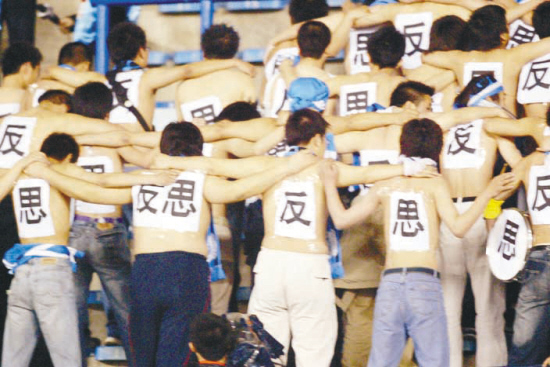 大連不愧為中國的足球城。2006年5月21日,一群大連球迷在看臺上光起膀子,背后貼滿了“反思”,這是中國球迷最真切的想法。可惜,中國足球沒有停止過反思,只是很少采取行動。