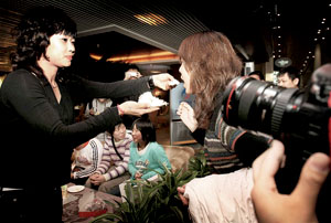 “粽子”們的舉動讓韓端激動得不知說什么才好。她拿起小刀切開蛋糕發(fā)給“粽子”和記者。“來,我們以蛋糕代酒,感謝你們對我的支持!”韓端說著給在場的人喂蛋糕。
