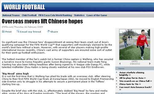 國際足聯官方網站昨天以《海外球員重燃中國足球希望》為題,對中國足壇新一代“留洋潮”進行了報道。文章稱,自國足無緣南非世界杯之后,中國球迷們承受了巨大的失望。他們自嘲是“世界上最好的球迷”,但沒有匹配的球隊。然而,隨著幾名球員最近再度走出國門,中國球迷們的熱情再度被調動。