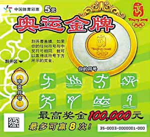 奧運彩票一直是彩民關注的焦點。經國家財政部批準,奧運即開彩票將率先上市,共有5個品種,3月下旬與彩民見面。根據國家體育總局體育彩票管理中心的安排,全國選定了河北、江蘇、浙江和山東四個省,作為試點銷售奧運即開彩票的地區,北京有望隨后上市。