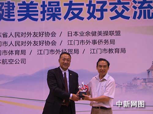 圖為江門市政府與日本業余健美操聯盟交換紀念品。