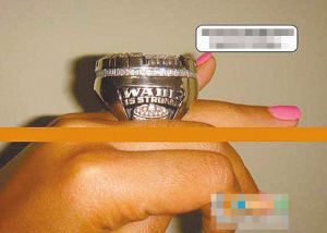 NBA巨星韋德剛剛向好萊塢女星尤尼昂求婚成功,結果又傳出緋聞。一名少女(上圖)將一組相片寄給網站,稱韋德和她一夜情后感覺很爽,大方地將大堆禮物送給了她,其中包括韋德唯一的總冠軍戒指(上圖)、佩飾金項鏈以及貼身T恤衫等。