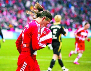 最先掀起“愛情風(fēng)暴”的是當(dāng)下狀態(tài)大勇的法國球星里貝里,他本場特意穿上粉紅球鞋戴上紅色手套,活脫脫一個紅色小精靈。第29分鐘他的任意球直接破門,為球隊很快扳平了比分。這也是里貝里連續(xù)第6場聯(lián)賽進(jìn)球,激動的他在進(jìn)球后特別親吻了寫有妻子瓦希芭(Wahiba)名字的左手腕繃帶。半場結(jié)束前,中衛(wèi)德米凱利斯收獲進(jìn)球。阿根廷人進(jìn)球后令人意外地?fù)炱鹎驅(qū)⑺M(jìn)球衣里,做出孕婦的姿勢。原來這一幕是獻(xiàn)給他已經(jīng)懷孕的女友伊萬格利娜的。下半場,拜仁的進(jìn)球風(fēng)暴并未停歇,而表達(dá)愛意的慶祝動作也似乎可以傳染?寺鍧蓪⒗镓惱锏膫髦星蝽斎牒,伸出三根手指,指代妻子希爾維婭和雙胞胎兒子。此后托尼和奧多配合后破門,意大利人也特別親吻著左手,原來大拇指上戴有未婚妻瑪塔送他的戒指。