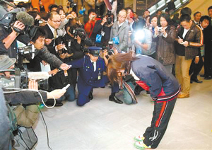 姐弟戀東窗事發(fā)后,中日兩國(guó)球迷及媒體的紛紛熱炒讓20歲的福原愛(ài)始料不及,12月2日她剛回國(guó)下飛機(jī),就有六十多名記者將她團(tuán)團(tuán)圍住,爭(zhēng)先恐后地就二人戀情大聲發(fā)問(wèn)。福原愛(ài)只得向記者們深深鞠躬致歉,眼含熱淚。