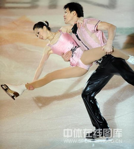 2009年2月25日,為答謝觀眾,獲得第24屆世界大學(xué)生冬季運(yùn)動(dòng)會(huì)花樣滑比賽前三名的選手,在哈爾濱國際會(huì)展中心體育館進(jìn)行表演。圖為獲得雙人滑冠軍的中國選手張丹/張昊激情演出。(中體在線圖片 白宇 攝)