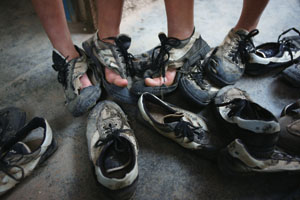 最讓大伙頭疼的還是球鞋。瓊中雨水多,球鞋很容易壞,有時兩個星期就能穿壞一雙。一開始谷教練還把隊員的鞋拿出去補(bǔ),后來為了省錢索性買回工具和線讓姑娘們自己補(bǔ)。