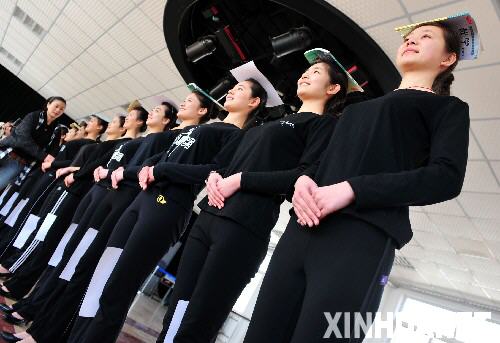 3月25日,曾擔任北京奧運會禮儀志愿者培訓老師的王迅(左一)在對志愿者進行形體指導。