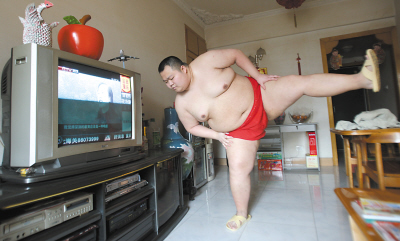 短短4年時間,體重從70公斤增加到了至少150公斤,沙坪壩區陳家灣一胖哥喜歡上了冷門的相撲運動,并打算3年后自費前往日本學習相撲術,成為一名職業相撲手。這名“重慶相撲男”的照片一貼上網就成了網絡紅人。由于重慶的相撲選手只有他一個,一直找不到合適的對手過招,無奈之下,前日晚上,這位紅人在天涯上發帖,正式邀請一位泰拳選手進行一場另類的比賽。