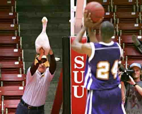 科比站上罰球線,眼睛拼盡全力盯著什么,卻久久不能投出這關(guān)鍵一球,他的心臟足以承受投籃不進(jìn)帶來的后果,那么,到底發(fā)生了什么?當(dāng)一名如此優(yōu)秀的籃球巨星站到罰球線而遲遲不能出手投籃結(jié)束比賽,肯定有他的原因,答案找到了:在科比走上罰球線的剎那間,他看到了來自觀眾席客隊球迷們?yōu)樗麥?zhǔn)備的饕餮大餐——罰球防火墻,一時間,美女照片、狂舞的塑膠棒、極具創(chuàng)意的搞笑漫畫,甚至可愛的鴨子都成了搞怪的最好道具。