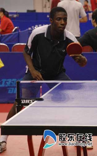 地球人都知道,世界高水平的乒乓球運(yùn)動(dòng)員都集中在東亞和歐洲,乒乓球幾乎與黑人運(yùn)動(dòng)員絕緣。據(jù)說(shuō),這是因?yàn)楹谌说募∪忸愋秃蜕窠?jīng)類型不適應(yīng)這項(xiàng)運(yùn)動(dòng)。不過(guò)今天上午記者在比賽現(xiàn)場(chǎng)看到了一位地道的黑人選手正與中國(guó)運(yùn)動(dòng)員對(duì)練,而且水平不低,打得有聲有色,稀奇,稀奇。