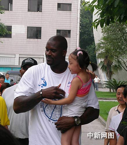 奧尼爾一下車,就受到孩子們的擁戴,現場一片歡呼聲和歡迎聲。已經有了三個孩子的奧尼爾,興奮地抱起給他獻花的一位七歲小女孩,親了親她的臉頰。在人們的簇擁下,奧尼爾參觀了汶川地震發生后修建的板房以及新校舍,詳細了解災后孩子們的學習生活狀況。