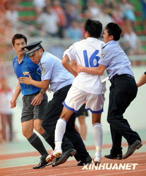 14號(hào)劉青在休息室門(mén)口看到此景,試圖掙脫警察的阻擋沖上前去。就在天津隊(duì)員追打裁判時(shí),一名球員將裁判的電子記錄牌扔在地上狂踩。這時(shí),警察趕到將天津隊(duì)員強(qiáng)行分離,并送至球場(chǎng)內(nèi)。看臺(tái)上的山東觀眾發(fā)出噓聲,并將水瓶扔向天津隊(duì)員。一名天津隊(duì)員向看臺(tái)伸出了中指,已坐在球場(chǎng)中間的李根聽(tīng)到球迷的罵聲后再次沖出人群試圖爬上看臺(tái),被警察制止。