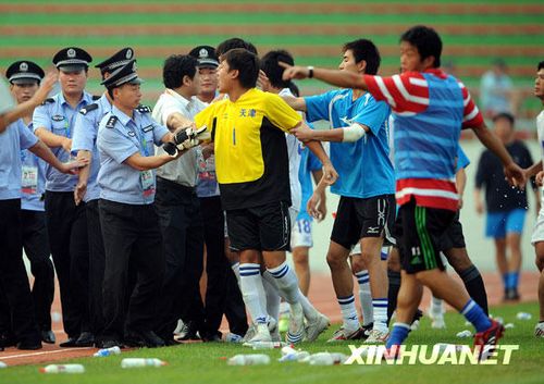 全運(yùn)會(huì)比賽超越競(jìng)技層面。昨日,全運(yùn)會(huì)男足甲組小組賽第三輪比賽結(jié)束,北京隊(duì)3比1戰(zhàn)勝天津隊(duì)獲得小組第一。輸?shù)舯荣惖奶旖蜿?duì)不但在比賽中被罰下三名球員,賽后幾乎所有隊(duì)員都參與了追打主裁判的“工作”,替補(bǔ)隊(duì)員12號(hào)趙世桐狂追了當(dāng)值主裁判何志彪近100米并將其摁倒,使其臉部著地后狂打數(shù)拳,由此掀開(kāi)了一場(chǎng)激戰(zhàn)。