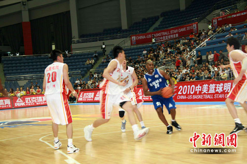 5月7日,周五的晚上,2010年中美明星籃球賽在浙江杭州黃龍體育館開賽。和姚明搭檔過的卡爾-蘭德里,拿過NBA總冠軍的“手套”佩頓,代表美國國家隊拿過奧運會金牌的里奇蒙德……賽前,主辦方的宣傳詞句中,不乏璀璨的光環(huán)。