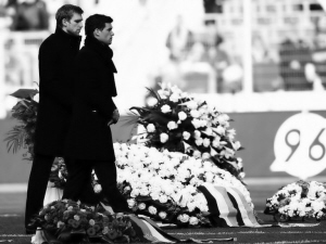 上午10點(diǎn)18分,恩克的靈柩被安置在了球場(chǎng)的中央,靈柩周圍擺放了白玫瑰和花環(huán),聯(lián)邦內(nèi)務(wù)部長(zhǎng)也放上了一叢顏色搭配成黑紅金色代表德國(guó)國(guó)旗的花。前德國(guó)總理施羅德和夫人以及德國(guó)著名主持人貝克曼也來(lái)到球場(chǎng)送別恩克。此時(shí),體育場(chǎng)外已經(jīng)變成了燭光的海洋,數(shù)萬(wàn)名未能進(jìn)場(chǎng)的球迷借此寄托哀思。