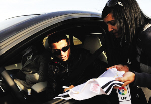 傷勢痊愈即將參賽,也令C羅心情大好。當(dāng)C羅在結(jié)束訓(xùn)練駕車離開時(shí),受到了皇馬球迷的熱烈歡迎。球迷高舉著他的球衣,呼喊C羅的名字,而C羅也以禮相待,盡量滿足球迷的要求,簽名、合影留念,皇馬頭牌十分有親和力,更是在車?yán)锬托牡貫橐晃幻琅蛎院灻⑶覞M足了其合影的要求。換了新發(fā)型,挑染了頭發(fā),帶著太陽眼鏡,穿著閃亮的皮衣,似乎來到了馬德里,和這里眾多的造型達(dá)人朝夕相處,C羅的時(shí)尚觸覺也更加提升了。