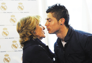北京時(shí)間昨天是C羅的生日,他和皇馬主席弗洛倫蒂諾一起在伯納烏參加了一項(xiàng)新聞發(fā)布會(huì)。皇馬俱樂部與馬德里大區(qū)達(dá)成了合作協(xié)議,皇馬基金會(huì)將會(huì)投資幫助馬德里大區(qū)那些未成年人、外國移民等等。在新聞發(fā)布會(huì)現(xiàn)場,C羅和弗洛倫蒂諾開起了玩笑。皇馬主席問C羅“你現(xiàn)在多大了”,C羅回答“我20歲了”。弗洛倫蒂諾當(dāng)即揭穿了C羅的謊言:“你已經(jīng)25歲了,你竟然已經(jīng)這么老了!”當(dāng)然,這次玩笑以全場歡笑告終。 作為皇馬代表,C羅還與馬德里大區(qū)女主席阿吉雷進(jìn)行了親密接觸。盡管阿吉雷的年齡足以當(dāng)C羅的奶奶,但葡萄牙人還是跟她來了一個(gè)貼面熱吻。在被C羅熱吻之后,阿吉雷顯得非常高興,立刻說:“C羅是世界上最出色的球員,沒有之一。”同時(shí)阿吉雷也宣稱,“皇馬是歷史上最出色的足球俱樂部。”
