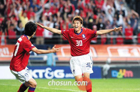 在世界杯開幕前26天進行的韓國國內(nèi)最后一場熱身賽上,韓國隊以2比0戰(zhàn)勝南美球隊厄瓜多爾。當(dāng)天勝利的主角是李升烈和李菁龍這兩名年輕隊員。